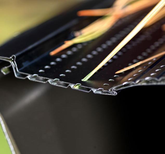 Une combinaison parfaite de deux membranes en aluminium perforé : la couche inférieure avec de grandes ouvertures oblongues, et la couche supérieure intègre des microperforations décalées avec précision pour former un filtre parfait d’une efficacité optimale.